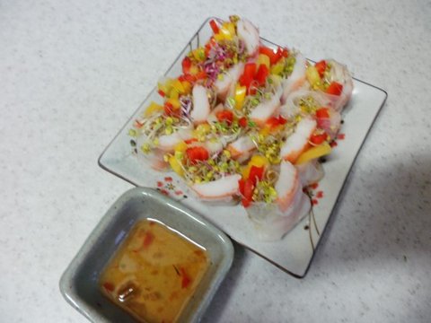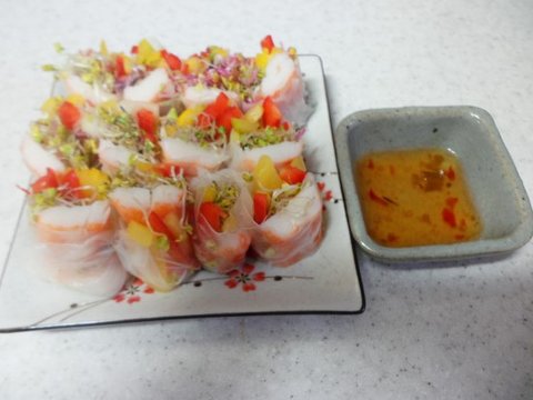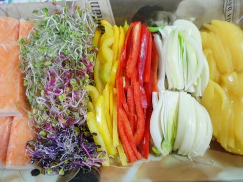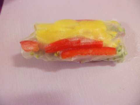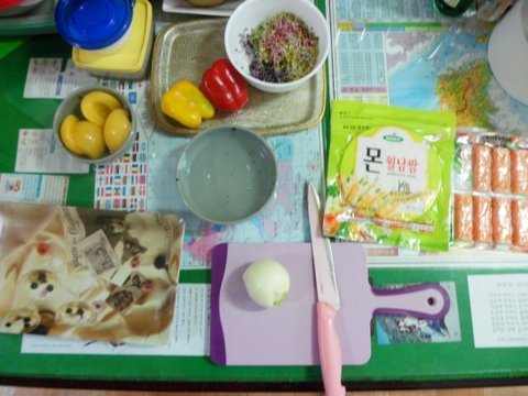 맛살(크래미), 황도(통조림), 어린잎, 양파(채썰어서), 파프리카, 속재료는