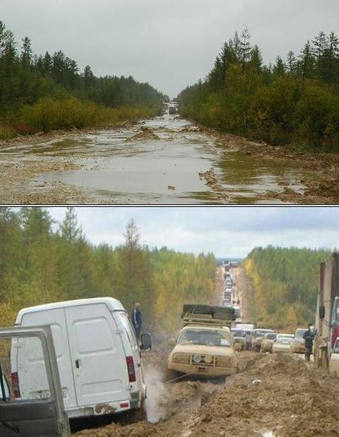 러시아의 국도 시베리안 로드는 겨울에는 얼어있다가 매 여름만 되면 죽음의 진흙으로 변한다 합니다. 해마다 수천대의 차량들이 진흙에 빠져 수 많은 사람들이 고립되는 수모를 겪으나 이 길을 이용하는 이용자들은 다른 우회도로도 없고 보수도 하지 않는 이 지옥 같은 길을 매년 이용해야 한다고 합니다.