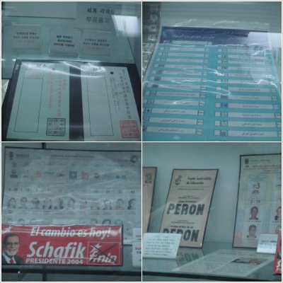 그 외에 여러 국가들의 투표용지도 볼 수 있었다. 나라별로 투표용지의 형태도 제각각이었다. 아프리카 국가들의 투표용지에서 특이한 점은 높은 비율의 문맹자 때문에 후보자와 정당이 글씨가 아닌 사진으로 나와있다는 것이었다. 또, 동티모르의 투표용지는 칼라 투표용지였는데 언뜻 '이 나라는 돈도 없는데 어떻게 투표용지를 칼라로 했을까' 생각했는데, 이것은 다 국제기구에서 지원해 준 것이라고 한다. 아르헨티나의 대통령이었던 '페론의 투표용지'가 있었는데, 이것은 아르헨티나에서는 후보자마다 투표용지가 있어 그 용지를 접어 투표함에 넣는 것이 투표방식이기 때문이라고 하였다. 또 특이한 투표용지로는 일본의 것이있었는데, 일본은 세계에서 유일하게 투표용지에 후보이름을 직접쓰고, 비례제를 뽑을 때에는 정당이름을 직접 쓰는 방식이었다.