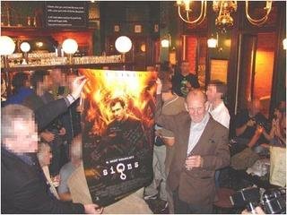 나이트 사말란의 영화 'Signs' 포스터를 들고 활짝 웃고 있는 것이 인상적이다>