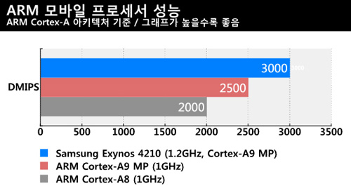 ARM에서 공개한 아키텍처별 성능을 보면 갤럭시 S에 들어갔던 Cortex-A8 아키텍처보다 DMIPS/MHz 성능이 25% 올라갔다. 여기에 동작 클럭도 1GHz에서 1.2GHz로 올라갔으니 정수 연산 성능은 갤럭시 S 대비 50% 가량 향상된 것이다. 또한 이 결과는 코어 1개당 성능이기 때문에 멀티태스킹 환경에서는 갤럭시 S II와 갤럭시 S의 성능 차이가 더 벌어질 것으로 예상된다.
