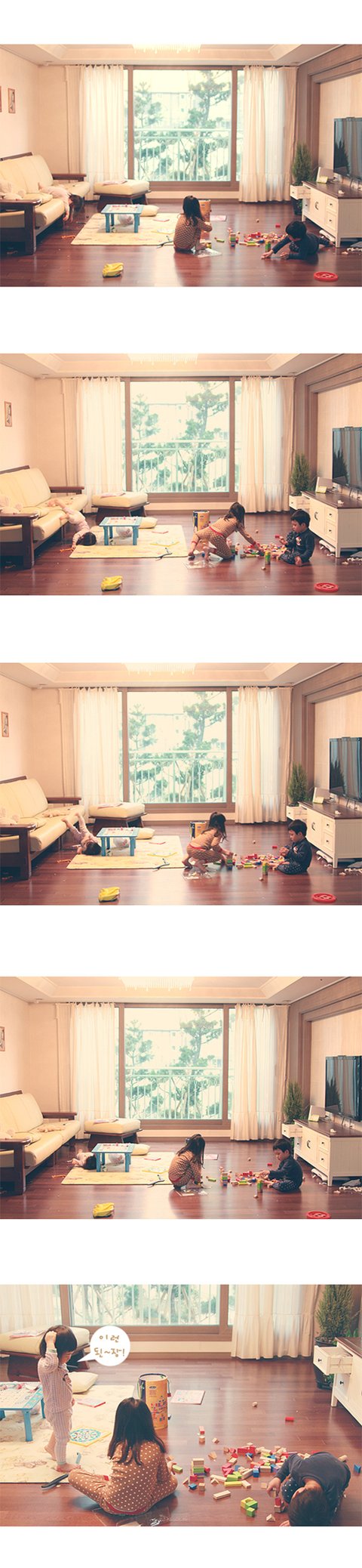저 지저분한 집구석에서 나린이랑 지후는 블럭놀이 하고 있고