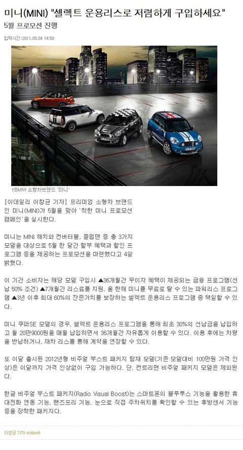이번에 미니쿠퍼는 프로모션 걸려서 36개월 무이자 할부까지 된다던데~