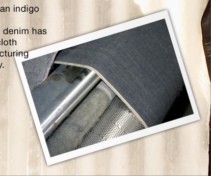 우븐조직으로 만들어진 원단으로 병렬방식으로 만들어지며 인디고 염료로 염색됩니다.