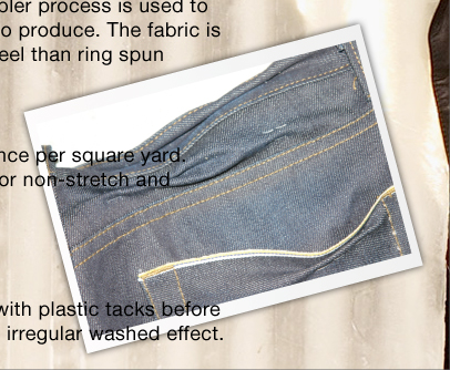 근대의 방식인 29inch기계에서 Elastane을 첨부하여 만들어지는 데님입니다. 2006년 S/S 콜렉션에서 처음 선보인 방식입니다.