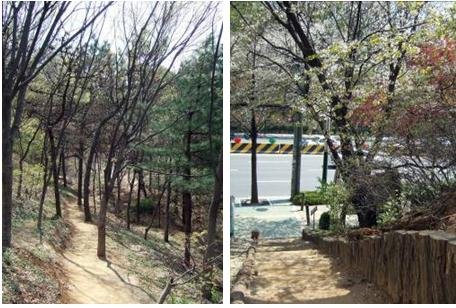 방배동 경남 아파트 삼거리에는 두 숲길의 입구가 있습니다. 우면산 등산로의 입구와 방배근린공원의 입구입니다. 우면산 등산로라고 해서 등산만 한다고 생각하시면 안 됩니다. 걷기 코스와 등산로 코스가 분리되어 있기 때문이지요. 세 가지 코스로 구성되어 있으니 취향에 맞게 선택하시면 되겠죠?