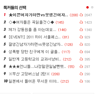 어라..? 톡커들의 선택 순위에서 갑자기 사라진 제판.. 설마해서 10위꺼 보니까 조회수는 제판의 반도 안되던데...요거요거.. 몬가 ... 스멜이![]()