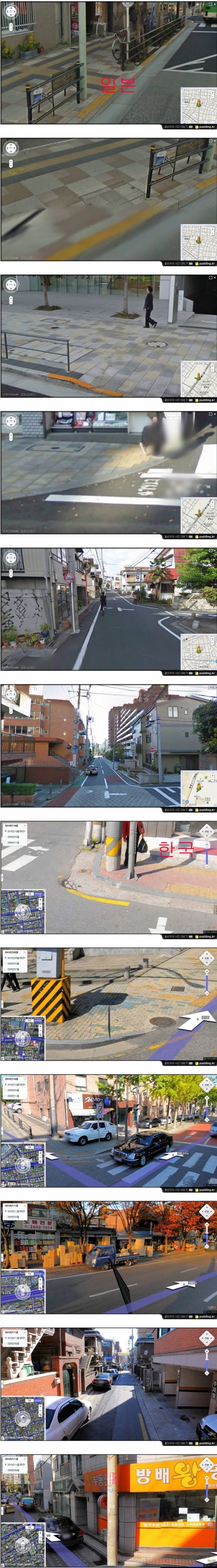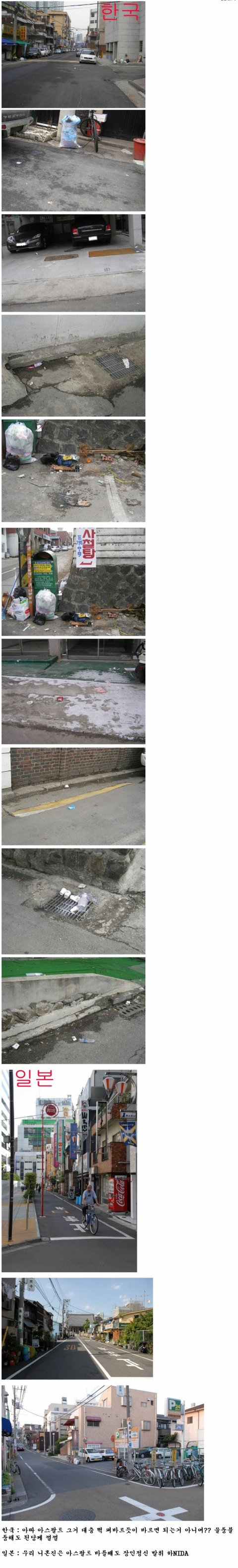 여기 비교사진을 보면 분명 " 한국사진은 일부러 더러운 장소만 골라서 찍고 일본사진은 깨끗한 장소만 찍었다." 라고 말하는 사람들이 있을겁니다. 여기 올리는 한국사진은 일부러 더러운 곳만 찍은것이 사실입니다. 하지만 일본사진은 일부러 깨끗한곳만 찍은것이 아니라 일본의 대부분의 거리가,