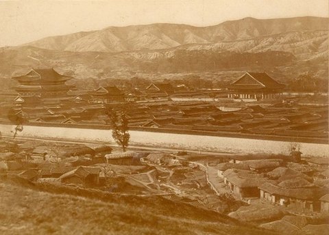 구한말 경복궁사진으로 높은 담장안으로 수많은 전각들이 꽉찬 모습이 인상적이다