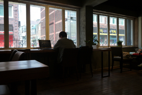 노트북으로 무언가 작업을 하고 계시던 분도 계셨어요. 낮은 테이블에 앉아서 노트북을 가지고 작업하기 불편하셨던분들 많으시죠? 여기 창가 테이블은 보시다시피 테이블이 꽤 높아서 작업하기가 한결 편하더라구요!!