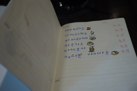 메뉴판 보면서 투덜거리는 길용이 투덜거리는 이유가 가격때문은 아니구요, 메뉴 구성이 조금 부족해서예요 이제 곧 여름인데 빙수나, 스무디도 있으면 금상첨화 일텐데!!