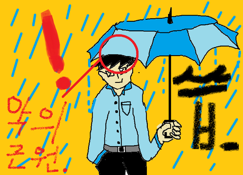 갑자기 비가 옴. 우산을 피고(일기예보 열혈팬) 황급히 가다가