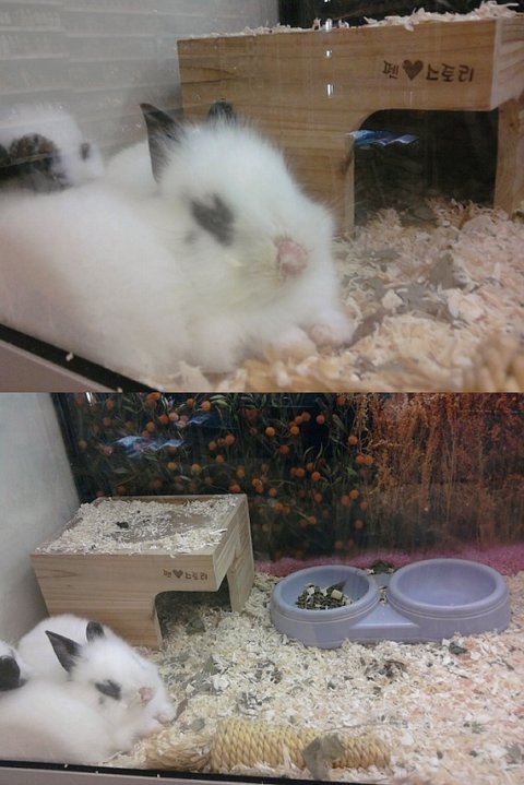 선반에 진열되어 있던 건초 봉지를 뜯어 새끼 토끼들의 케이지에 건초를 넣어주니 토끼들이 처음엔 생소한 먹이라 그랬는지 머뭇거리더니 냄새를 맡고는 이내 허겁지겁 잘 먹었습니다.