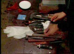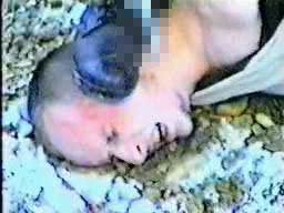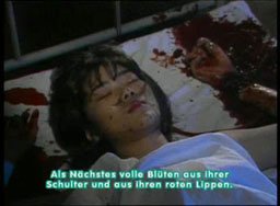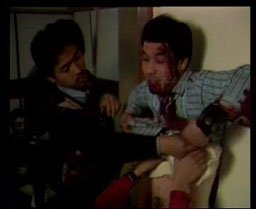 <문제의 고어물 '기니피그 제2탄 - 혈육의 꽃'. 영화의 내용은 지극히 간단하다. 갑옷을 입은 남자가 거리에서 지나가던 여자를 납치해다 밀폐된 곳에 사지를 묶어놓고 팔, 다리, 목, 팔목, 발목, 눈알 등 여자 신체의 모든 부위를 사각사각 잘라낸다. 그 이후 잘라진 머리를 들고 키스하는 장면이 영화의 끝. 최근 '이치 더 킬러' 등의 초변태 스플래터 무비를 보지 않은 상태였다면 제정신으로 보기 어려울정도의 잔혹물이겠지만... 어떤 평에 의하면, 이 영화에서 느낄 수 있는 것은 공포라기보다는 고깃덩이처럼 갈기갈기 난자당하는 인간 육신에 대한 혐오와, 그 반대편에서는 그 금기된 행위를 눈으로 직접 목격하며 느낄 수 있는 변태스러운 가학적 만족감이었다 라고.. 인터넷상에는 '노틀담의 안드로이드' '맨홀속의 인어' 등 시리즈물이 매니아들 사이에서 유포되고 있는 모양>
