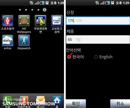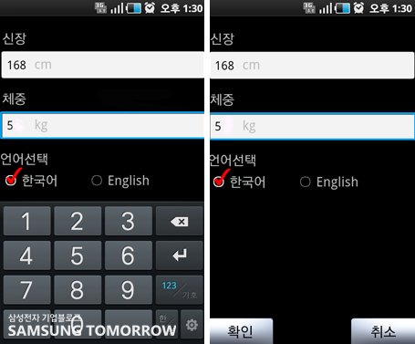 여자의 체중은 비밀...^^ 키와 몸무게를 제대로! 적고 나서 확인을 누르면 설정이 완료됩니다. 아! 그리고 여기서~ 언어 선택은 한국어 이외에 영어로도 할 수 있답니다. 주위에 갤럭시 제품을 쓰는 외국인 친구가 있다면 소개시켜주세요^^