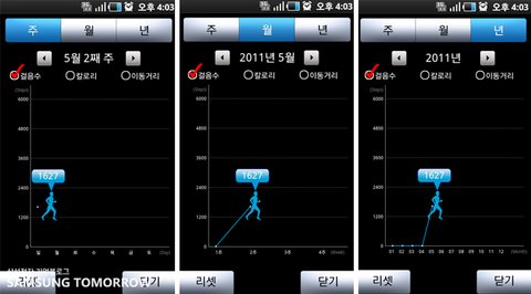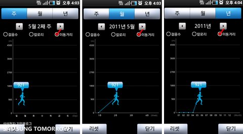 기록 여태까지의 만보기 기록들을 확인할 수도 있습니다. 주/월/년 별로 이동거리와 칼로리를 한 눈에 확인할 수 있습니다.