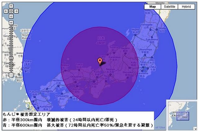 몬쥬 고속증식로 폭발후 반경 300km가 플루토늄으로 뒤덮이게 됩니다. 이쯤 가면 일본 혼슈 지방은 생지옥이 된다고 보면 되겠지요. 아까 앞에서 말했던 치사량 기억나나요? 0.26mg만 흡입해도 죽는겁니다. 게다가 반감기가 2만년이 넘어가니 이거 어쩌겠습니까.. 후쿠시마처럼 얌전하게 끝나지는 않을겁니다. 최악의 경우 동일본 대지진/쓰나미로 수만명 죽은건 우스울 정도의 재앙이 일어날겁니다.