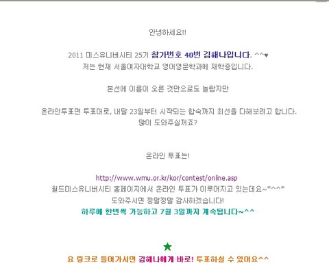 자기 친구 홍보나 해달라고 하네요 ㅋㅋㅋ 고병진군의 친구가 이번에 2011 미스 유니버시티에 나가게 되었습니다^^ !!