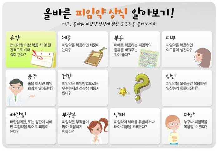전세계적으로 볼 때, 매일 9천만명 이상의 여성들이 먹는 피임약을 복용하고 있는 반면, 우리나라의 피임약 복용육을 다른나라에 비해서 현저하게 낮은 수준이라고 합니다. 콘돔을 사용했을 때 실패 확률이 15%가 된다는 사실을 알고 계신가요? 하지만 먹는 피임약은 약 99%에 달하는 높은 피임효과를 가지고 있다고 합니다. 정말 놀라운 사실이네요…이제 내 몸은 내가 지켜야 겠어요!!! 오빠만 믿지 말고요 ^^