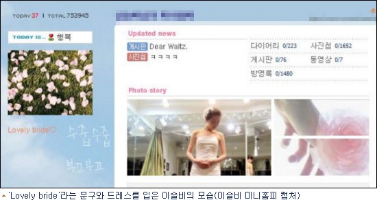특히 이슬비는 자신의 미니홈피에 웨딩드레스 입은 사진을 올리고 "저 결혼합니다"란 문구가 씌여진 배경화면과 강성의 '너 이길 바래'를 배경음악으로 설정해 놓는 등 행복한 예비신부의 모습을 보였다.