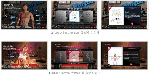 삼성 TV 앱스에서 남성은 'Upper Body for men'(상체운동), ‘lower Body for men'(하체운동), 여성은 'Upper Body for Women'(상체운동), 'lower Body for Women'(하체운동)을 선택해 부위별 운동을 할 수 있습니다.
