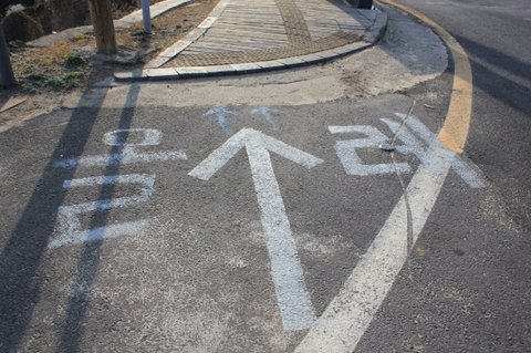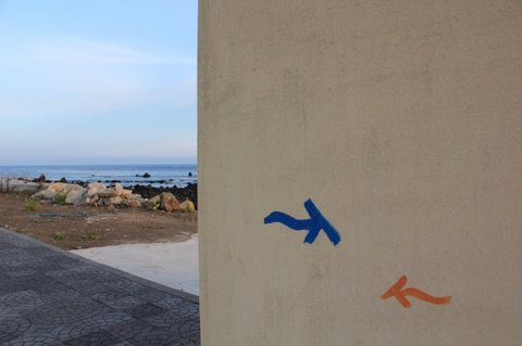 올레길에서 역주행자는 감귤색 화살표, 정주행자는 파란색 화살표를 따라가면 된당.