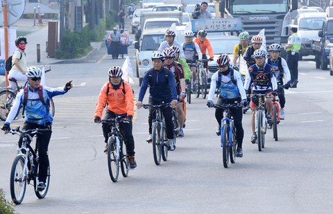 자전거버스 이용자들이 안전하게 도로 위를 달리는 모습