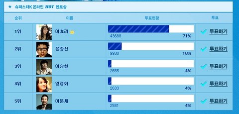 슈퍼스타K의 온라인 핫멘토상 후보로 이효리가 1위를 달리고 있더라구요