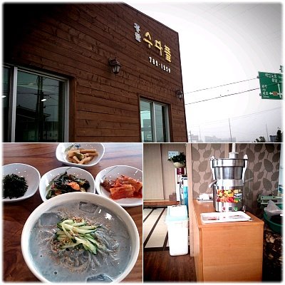 그 휴게소가 바로 여기랍니다! 수다뜰! 화니삼촌이 데려다 주면서 내려오다 여기서 잠깐 쉬면서 당근쥬스를 꼭 먹어보라고 하더라구요~ 식사를 하면 쥬스는 공짜이고 따로 먹으면 3,000원이면 한잔 먹을 수 있는데 당근 싫어하는 저도 정말 맛있게먹었어요~ 비오는 날이였지만 너무 걸어 더웠던 전 콩국수를 시켰는데! 그 맛이 정말 일품 이였어요.. 열무김치와 콩국수>ㅁ< 먹고싶다 ㅋㅋ
