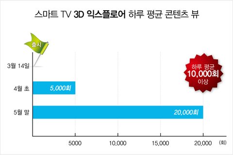 지난 3월 16일 첫 선을 보인 3D 익스플로어는 지난 4월 초 기준 하루 평균 약 5000회 정도 콘텐츠뷰를 보였습니다. 하지만 이후 5월말에는 하루 평균 콘텐츠 뷰가 2만회를 상회하며 스마트 TV사용자들로부터 높은 호응을 얻었습니다. 이는 전세계 삼성 스마트 TV 사용자가 하루 평균 1만회 이상 '3D 익스플로어'의 3D 콘텐츠를 즐긴 셈입니다.