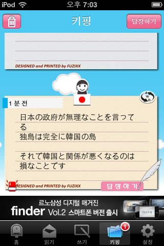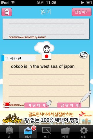 근데 얼마전 사회선생님께 독도관련이야기를 듣고 안타까운마음에 요즘 재밌게 사용하는 어플 '두근두근 우체통' 을 사용해 'Dokdo in the East Sea of Korea' 라는 독도 홍보문구를 전송했음니다.