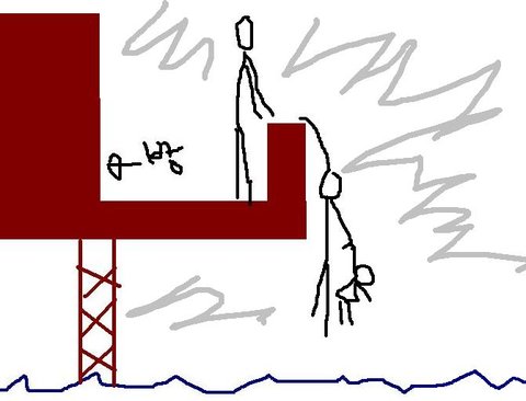 B는 어떤 여자애를 안고 바다에 던지려고 하고있음.(여자앤 대략 6살정도로 보임)