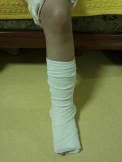 왼쪽 복숭아뼈 옆에 인대가 늘어나서 붕대를 풀면 다리가 퉁퉁 부어있는상태입니다.