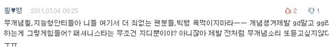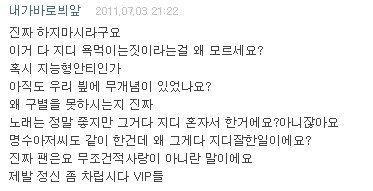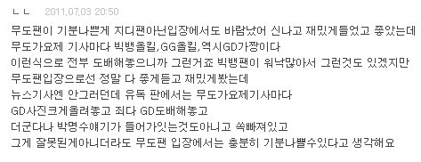 엄연히 '무한도전' 판이구요. 무한도전이 잘했다, 근데 이번에 무한도전 가요제때 지용오빠가 나왔는데, 지용오빠는 엄연히 말하자면 게스트인 쪽인데 7년동안 매주 금요일,목요일마다 촬영했던 오빠들. 그리고 김태호PD님꼐서 이번이 제일 행복했다. 길 오빠는 무한도전에 있어서 행복하다.꿈 같다. 이런 말씀 하시는데, 정말 무한도전 팬으로써 계속 'GG'이러는거 화가 나구요. 빅뱅 팬인 VIP로써 이러는거 정말 부끄럽습니다. 그리고 화도 나요. 우리는 안했는데, 우린 모두 응원했는데. 왜 우리가 무개념 소리를 듣지? 이렇죠. 그리고 결국 화는 저 위에 댓글 중 한분이 쓰셨던 것 같이 착한 븨앞분들이 처리 해주시구요. 그리고 캡쳐 못한 한 댓글 중 '이러니까 권지용이 싫어' 라는 댓글이 있더라구요 ^^ 아시겠어요? 이럴수록 지용오빠 안티만 늘어가구요. 무개념 븨앞 소리 다시 들어요. 진짜 이러지 말아주세요.