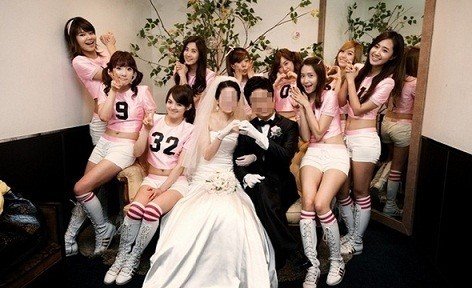 사진 속 소녀시대는 ‘oh’ 활동시 의상을 입고 있으며 신혼부부를 가운데 두고 둘러 앉아 손으로 하트 모양을 그리며 환하게 웃고 있다.