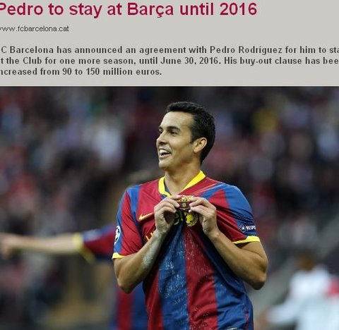 바르셀로나는 6일(한국시간) 구단 홈페이지를 통해 "페드로가 2016년 6월 30일까지 머무는데 최종적으로 합의했다"라며 "바이아웃은 종전 9000만 유로(약 1386억 원)에서 1억 5000만 유로(약 2310억 원)로 상승했다"고 공식 발표했다.