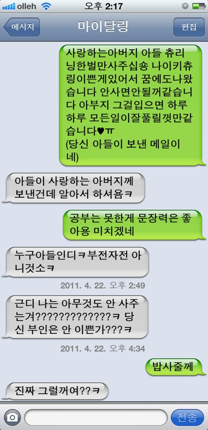 참 유머있고재치있는 부자지간인데 문자가 ....ㅋㅋㅋㅋ