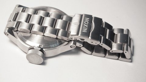시계줄의 버튼 부분에는 닉슨시계 브랜드 로고와 텍스트가 적혀있습니다.