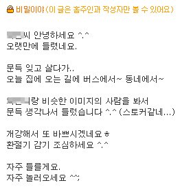 "ㅇㅇ씨 안녕하세요 우연히 싸이 왔다가 프로필 보고 대학교랑 나이랑 사는 동네가 같아서 신기해서 쪽지 보내요 답장은 안해두되요 그냥 신기해서 쪽지 보내봐요"