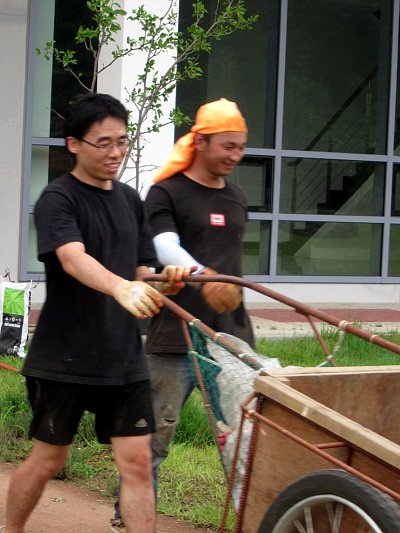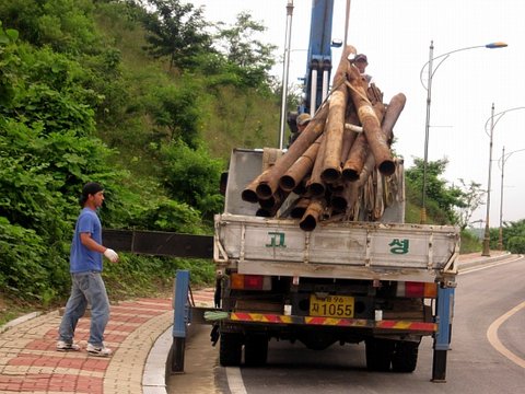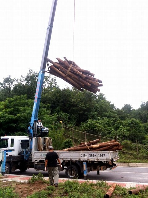 크레인이 왔네요. 저 어마어마한 양의 철책들을 설치장소로 옮기기 위해서 꼭 필요했죠. 인력으로 옮겼다가는 시간도 시간이거니와.. 척추가 아작 났을 거네요.ㅠㅠ