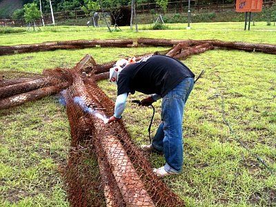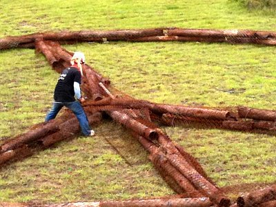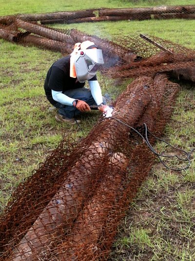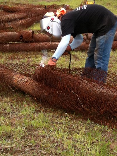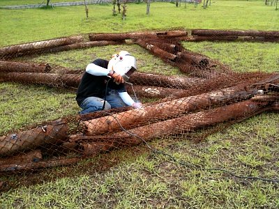 이제 철주 위에 철망을 덮기 위해, 알맞은 크기로 풀어 헤치고 절단하고..