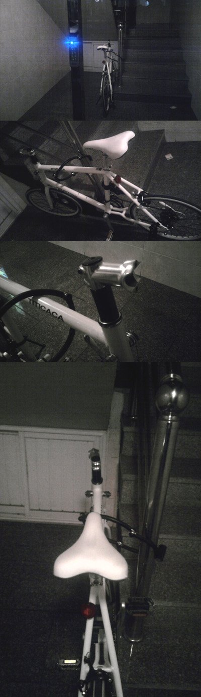 얘가 우리 까둥이(까칠한 흰둥이) 인데요 저 앞에 흰색 핸들과 브레이크 레버를 다 뽀려갔어요 ㅜㅜ 이넘들 전문 털이임 ㅋ 너넨 죽었다~!!!