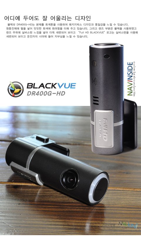 블랙뷰 DR400G-HD는 본체를 회색톤을 사용하여 패키지박스 디자인과 통일감을 느낄 수 있습니다. 원통전체에 펄을 넣어 밋밋한 회색에 화려함을 더해 주고 있습니다. 그리고 랜즈 부분은 블랙을 사용하였고 랜즈 주위에 실버스텐 느낌을 넣어 더욱 세련되어 보이고 “Full HD BLACKVUE”로고는 실버스텐을 사용해 세련되어 보이고 운전자의 시야에 들어 자부심을 느낄 수 있습니다.