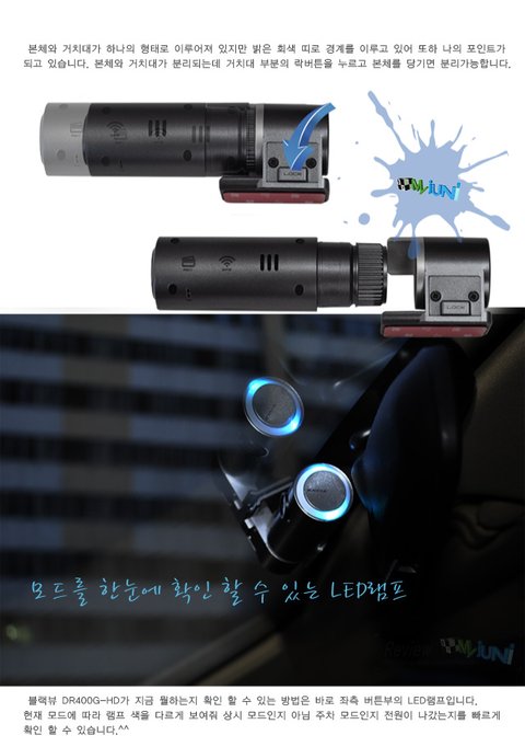 블랙뷰 DR400G-HD가 지금 뭘하는지 확인 할 수 있는 방법은 바로 좌측 버튼부의 LED램프입니다. 현재 모드에 따라 램프 색을 다르게 보여줘 상시 모드인지 아님 주차 모드인지 전원이 나갔는지를 빠르게 확인 할 수 있습니다.^^