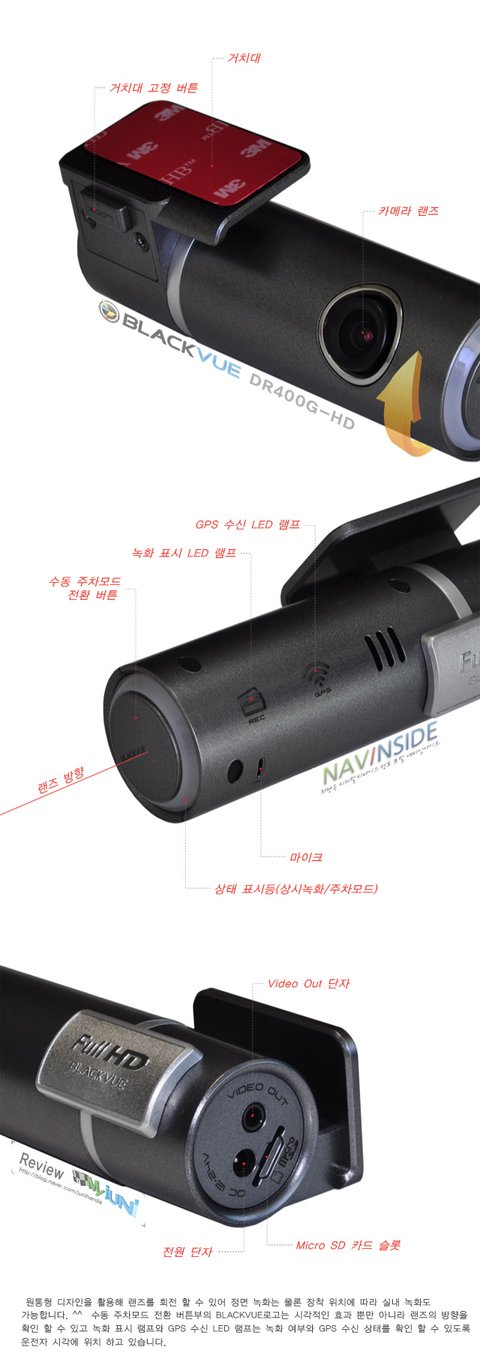 원통형 디자인을 활용해 랜즈를 회전 할 수 있어 정면 녹화는 물론 장착 위치에 따라 실내 녹화도 가능합니다. ^^ 수동 주차모드 전환 버튼부의 BLACKVUE로고는 시각적인 효과 뿐만 아니라 랜즈의 방향을 확인 할 수 있고 녹화 표시 램프와 GPS 수신 LED 램프는 녹화 여부와 GPS 수신 상태를 확인 할 수 있도록 운전자 시각에 위치하고 있습니다.