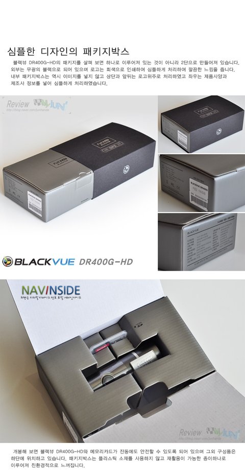 블랙뷰 DR400G-HD의 패키지를 살펴보면 하나로 이루어져 있는 것이 아니라 2단으로 만들어져 있습니다. 외부는 무광의 블랙으로 되어 있으며 로고는 회색으로 인쇄하여 심플하게 처리하여 깔끔한 느낌을 줍니다. 내부 패키지박스는 역시 이미지를 넣지 않고 상단과 앞뒤는 로고위주로 처리하였고 좌우는 제품사양과 제조사 정보를 넣어 심플하게 처리하였습니다.