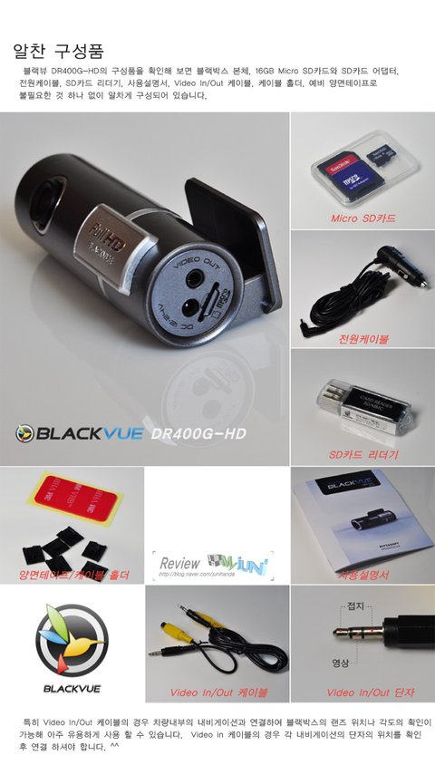 블랙뷰 DR400G-HD의 구성품을 확인해 보면 블랙박스 본체, 16GB Micro SD카드와 SD카드 어댑터, 전원케이블, SD카드 리더기, 사용설명서, Video In/Out 케이블, 케이블 홀더, 예비 양면테이프로 불필요한 것 하나 없이 알차게 구성되어 있습니다.