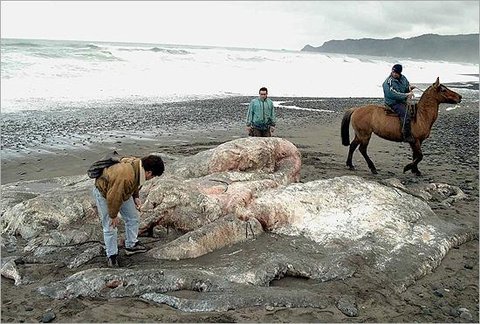 미스테리생명체6. 해안가에 떠올라온 어떤 생물체의 사체 바다에 살던 상당히 큰 연체동물같은데 워낙크고 발견된바 없던거라서 정확한 규명을 못했다 하더군요 어쨌뜬 어떤 생물체의 사체입니다.