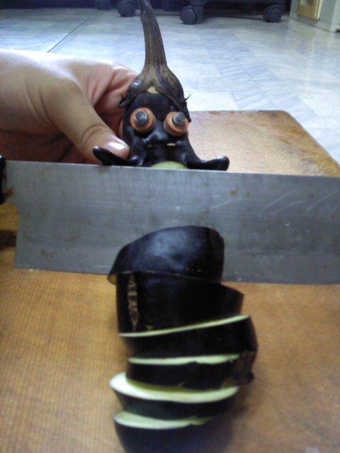 가지의 몸통을 칼로 숭덩숭덩 잘랐다. 뽀얀 속살이 보였다. 가지의 그 분노의 불꽃은 온데간데 없이사라지고 정말 자기를 해칠줄은 몰랐는지 눈이 튀어나왔다. 난 칼질을 멈추지 않았다. 난.. 남자니까(응?)