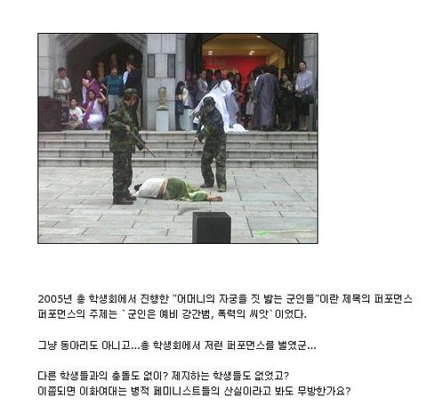 지난 2005년 이대는 또 다시 군을 비하하는 퍼포먼스를 벌여 물의를 빚었다. 총 학생회에서 진행한 "어머니의 자궁을 짓 밟는 군인들"이란 제목의 퍼포먼스가 바로 그것. 퍼포먼스의 주제는 `군인은 예비 강간범, 폭력의 씨앗`이었다.